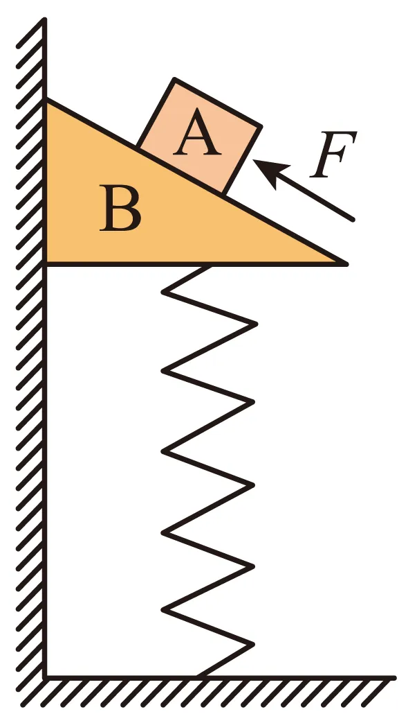 2. 如图所示,物块A放在直角三角形斜面体B上面,B放在弹簧上面并紧挨着竖直墙壁,初始时A、B均保持静止。现用沿斜面向上的恒力F推A,但A、B仍静止不动。下列说法不正确的是( )