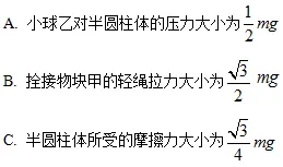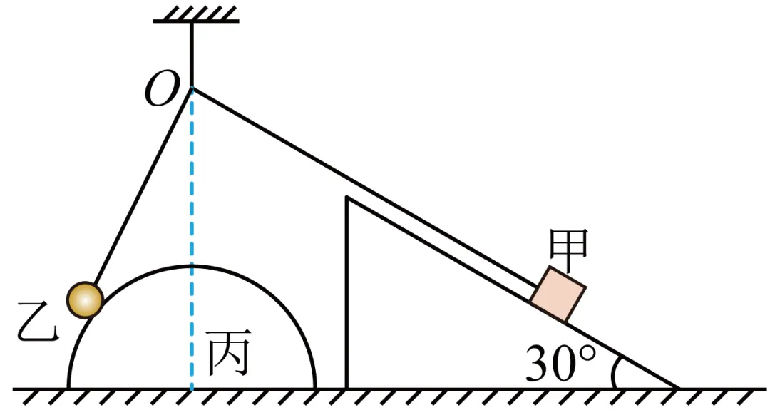 的半圆柱体丙放在水平面上,可视为质点的光滑小球乙质量为m,用轻绳拴接置于半圆柱上;质量为2m的物块甲用平行于斜面的轻绳拴接放在斜面体上,拴接小球乙与拴接物块甲的轻绳与竖直的轻绳系于O点,且O点位于半圆柱圆心的正上方。已知O点到水平面的高度为2R,拴接小球乙的轻绳长度为R的根号三倍,整个装置处于静止状态,重力加速度为g。则下列说法正确的是( )