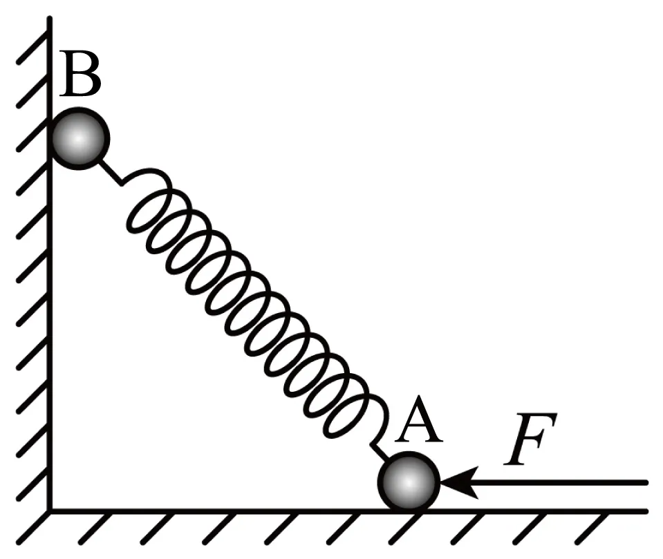 10. 如图所示,竖直墙壁和水平地面均光滑,两个质量均为m的完全相同的小球A和B通过轻质弹簧连接,在水平推力F的作用下处于静止状态。改变水平推力的大小,使A球缓慢向左移动,弹簧始终在弹性限度内且不会发生弯曲,当弹簧与水平方向夹角为45°时撤去推力F,重力加速度为g,下列说法正确的是( )