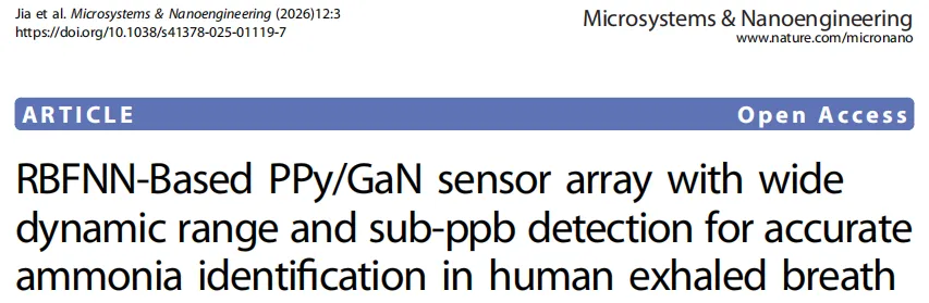 标题:RBFNN-Based PPy/GaN sensor array with wide dynamic range and sub-ppb detection for accurate ammonia identification in human exhaled breath作者:Zhengyang Jia1,2, Weili Wang3, Dan Han1,2✉, Lianao Yan1,2, Juxu Guang1,2, Qi Duan1,2, Yuxuan Wang1,2,Zhitao Cheng1,2, Guojing Wang4,5, Weidong Wang4,5 and Shengbo Sang 1,2✉期刊:Microsystems & NanoengineeringDOI:10.1038/s41378-025-01119-7氨气(NH₃)作为慢性肾病(CKD)等肝肾疾病的关键呼气生物标志物,其精准检测对疾病早期预警与无创诊断至关重要。现有氨气传感器存在诸多局限:金属氧化物传感器需高温工作,不适用于人体呼气监测;纯聚吡咯(PPy)等导电聚合物传感器选择性差、检测限偏高,难以满足呼气中 ppb 级痕量氨气的检测需求。第三代半导体氮化镓(GaN)具备宽禁带、高稳定性等优势,但基于 GaN 的氨气传感器研究较少,检测性能有待提升。因此,开发室温下具有超宽检测范围、高灵敏度与强抗湿性的氨气传感器,成为呼气诊断领域的关键技术缺口。- 设计并制备 PPy/GaN 复合结构氨气传感器,通过材料复合与工艺优化,实现室温下氨气的高灵敏、高选择性检测。