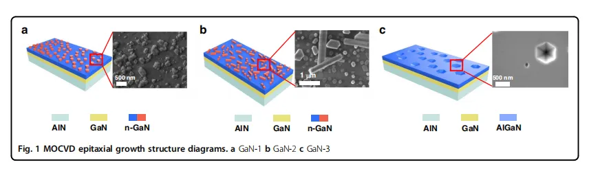 图1 金属有机化学气相沉积外延生长结构示意图。 a GaN-1, b GaN-2, c GaN-3