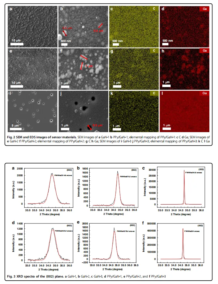 - 结构创新:采用 MOCVD 精准制备系列 GaN nanostructure(颗粒状、柱状、六边形凹坑状),通过原位氧化聚合实现 PPy 在 GaN 表面的均匀负载,构建异质结复合体系,最大化界面电荷转移效率与气体吸附位点。