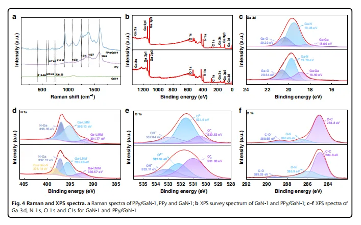 c–f GaN-1与PPy/GaN-1的Ga 3d、N 1s、O 1s及C 1s的XPS精细谱。