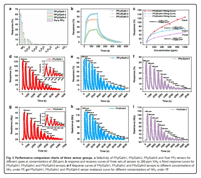 - 机制创新:通过原位 XPS 等表征揭示传感机制,证实 GaN 与 PPy 的异质结效应加速电荷转移,吸附氧物种参与氨气氧化反应,协同 PPy 的去质子化过程共同提升传感性能。