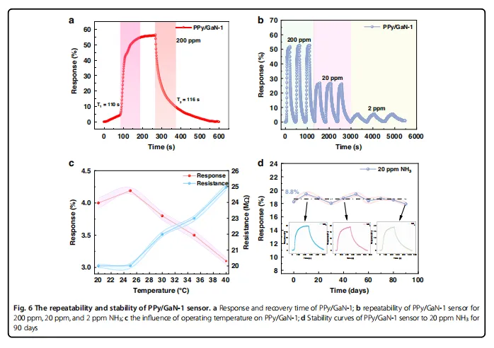 图6 PPy/GaN-1传感器的重复性与稳定性。 a PPy/GaN-1的响应和恢复时间;b PPy/GaN-1传感器对200 ppm、20 ppm和2 ppm NH₃的重复性测试;c 工作温度对PPy/GaN-1传感器性能的影响;d PPy/GaN-1传感器对20 ppm NH₃长达90天的稳定性曲线。