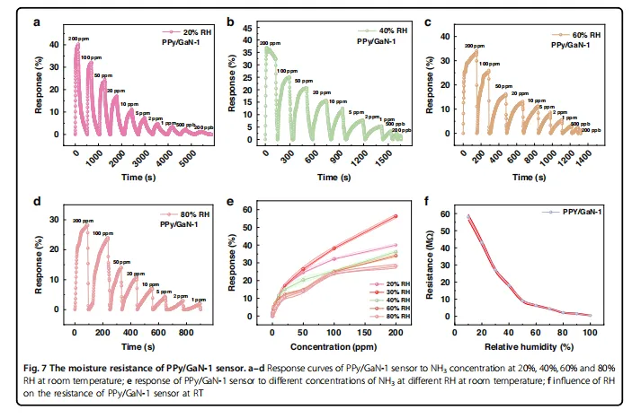 图7 PPy/GaN-1传感器的抗湿性能。 a–d PPy/GaN-1传感器在室温下、相对湿度分别为20%、40%、60%和80%时对不同浓度NH₃的响应曲线;e PPy/GaN-1传感器在室温下、不同相对湿度条件下对不同浓度NH₃的响应情况;f 相对湿度对PPy/GaN-1传感器在室温下电阻值的影响。
