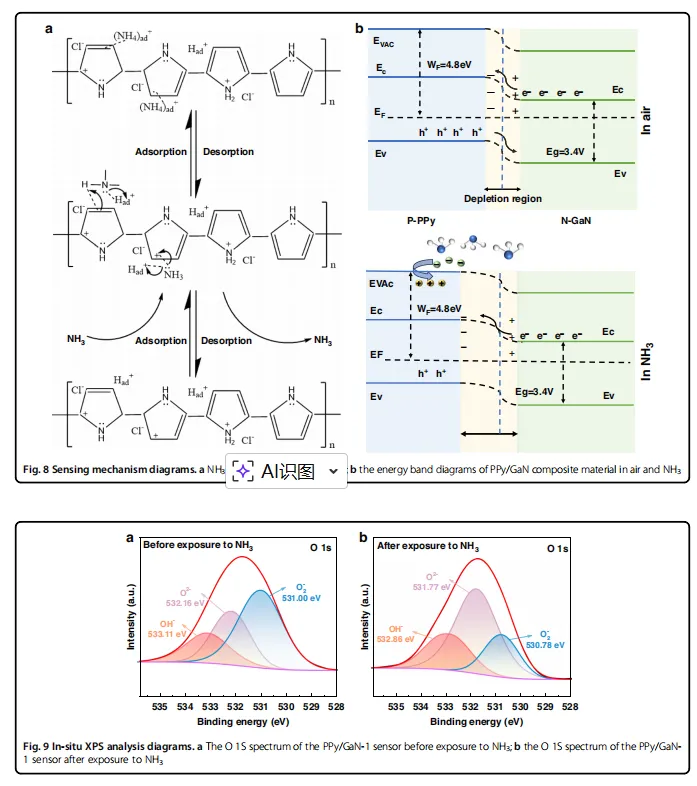 图8 传感机制示意图。 a PPy对NH₃的传感机制;b PPy/GaN复合材料在空气和NH₃中的能带图