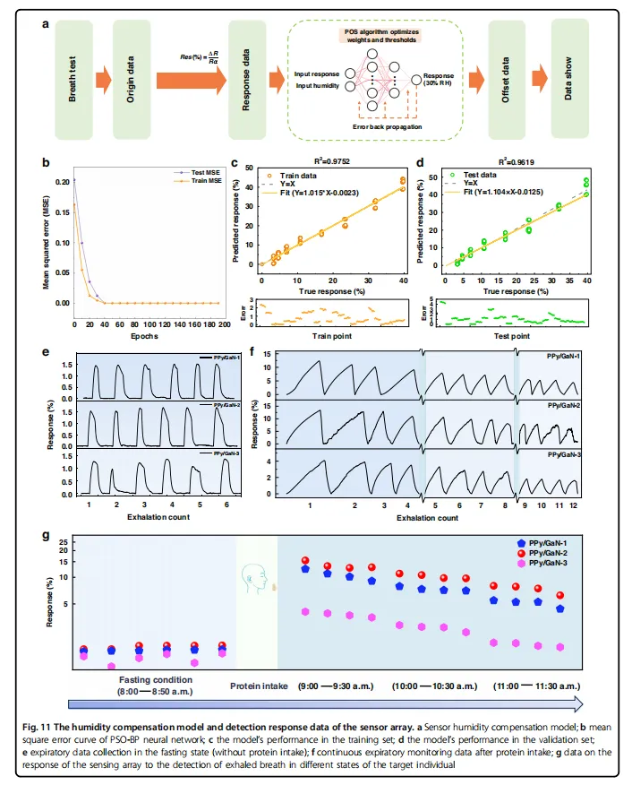 图11 传感器阵列的湿度补偿模型与检测响应数据。 a 传感器湿度补偿模型;b PSO-BP神经网络均方误差曲线;c 模型在训练集中的表现;d 模型在验证集中的表现;e 空腹状态下(未摄入蛋白质)呼气数据采集结果;f 摄入蛋白质后连续呼气监测数据;g 传感阵列对目标个体不同状态下呼出气体检测的响应数据。