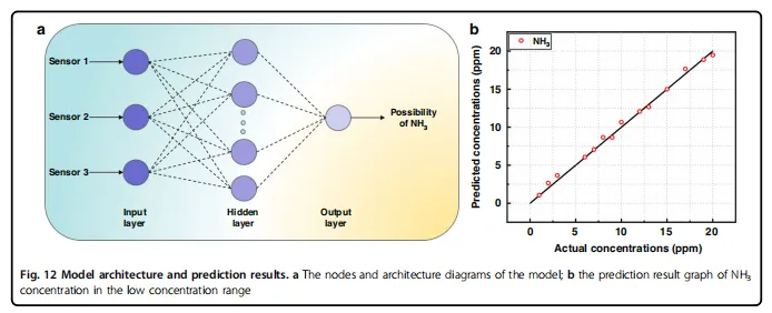 图12 模型架构与预测结果。 a 模型的节点与架构图;b 低浓度范围内NH₃浓度的预测结果图