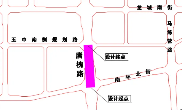 唐槐路(南环北街—五中南侧规划路)建设工程南起南环北街,北至五中南侧规划路,长约300米,规划红线宽 60 米,为城市主干路,用地面积约1.8公顷。