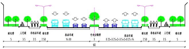 中间3米绿化分隔带,两侧各14米机动车道,2.5米机非绿化分隔带,3.5米非机动车道, 3.5米人行道(含1.5米树穴带),5米绿化带。
