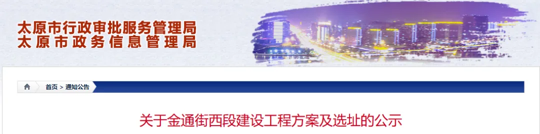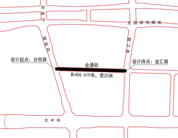 金通街西段建设工程西起汾西路,东至金汇路,长约406米,规划红线宽20米,为城市支路,用地面积约0.8公顷。
