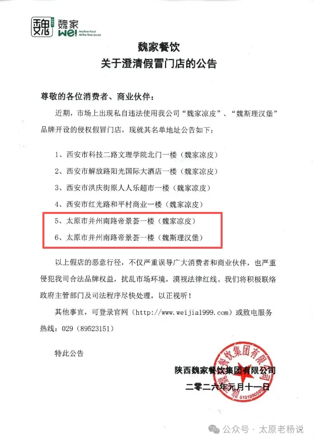 1月11日魏家餐饮发布关于澄清假冒门店的公告,尊敬的各位消费者、商业伙伴:近期,市场上出现私自违法使用我公司“魏家凉皮”“魏斯理汉堡”品牌开设的侵权假冒门店,现就其名单地址公告如下:1、西安市科技二路文理学院北门一楼(魏家凉皮)。2、西安市解放路阳光国际大酒店一楼(魏家凉皮)。3、西安市洪庆街鸿都购物广场一楼(魏家凉皮)。4、西安市红光路和平村商业一楼(魏家凉皮)。5、太原市并州南路帝景荟一楼(魏家凉皮)。6、太原市并州南路帝景荟一楼(魏斯理汉堡)。以上假店的恶意行径,不仅严重误导广大消费者和商业伙伴,也严重侵犯我司合法品牌权益,扰乱市场环境,漠视法律红线。我们将积极联络有关主管部门及司法程序尽快处理,以正视听!其他事宜,可登录官网(http://www.weijia1999.com)或致电服务热线:029(89523151)。特此公告,陕西魏家餐饮集团有限公司二零二六年元月十一日。来源:起点新闻