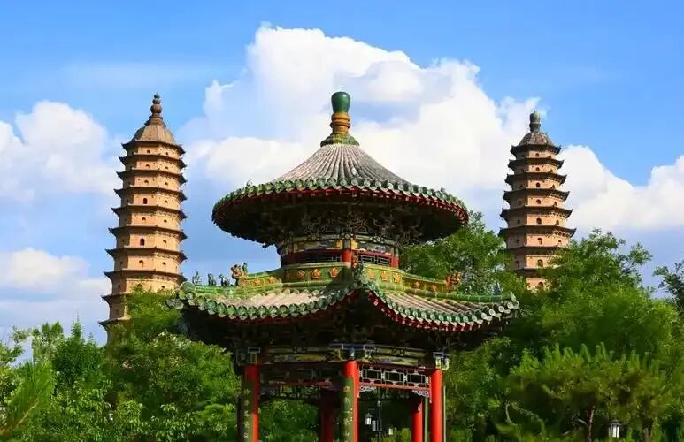 双塔寺学名永祚寺,明万历年间立起来,四百多年没歪,城里抬头就能望见两根塔影。