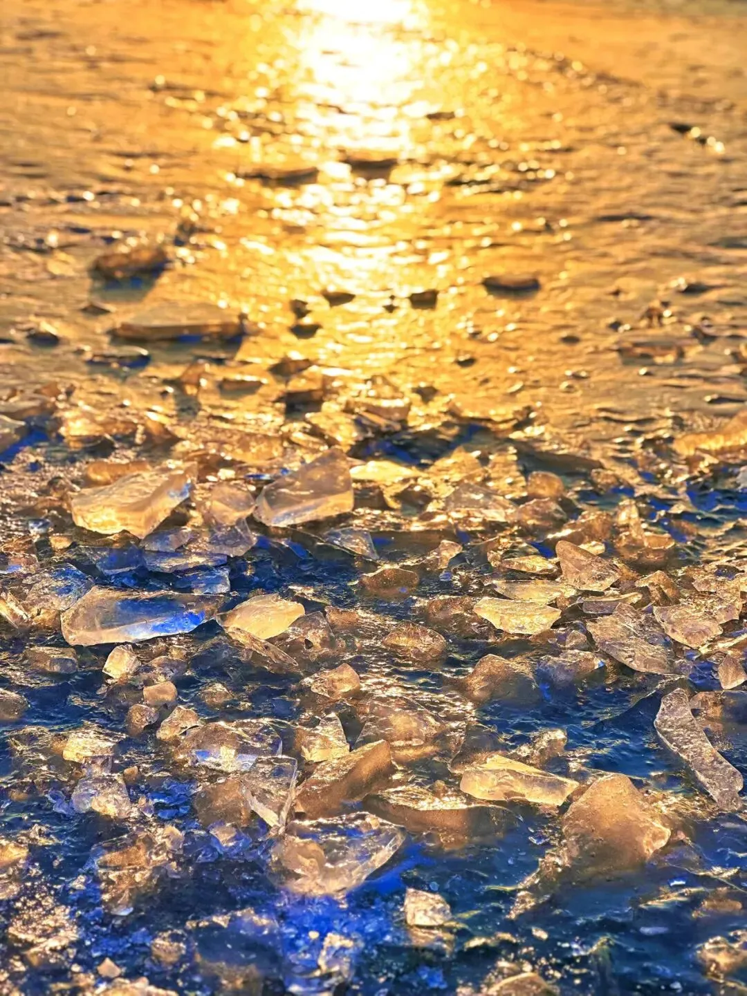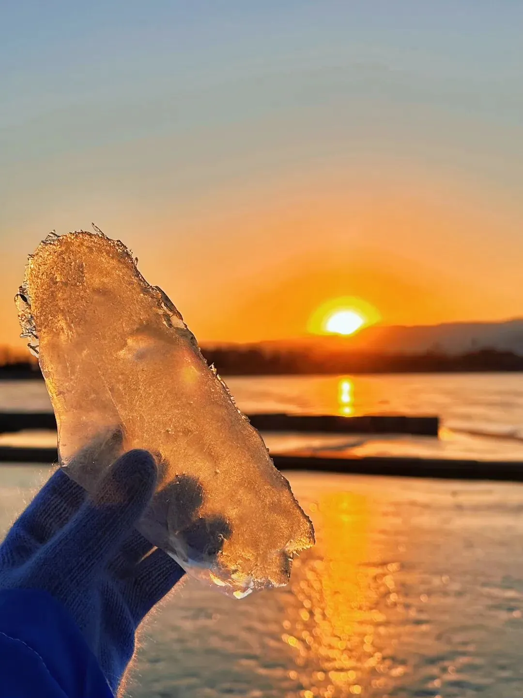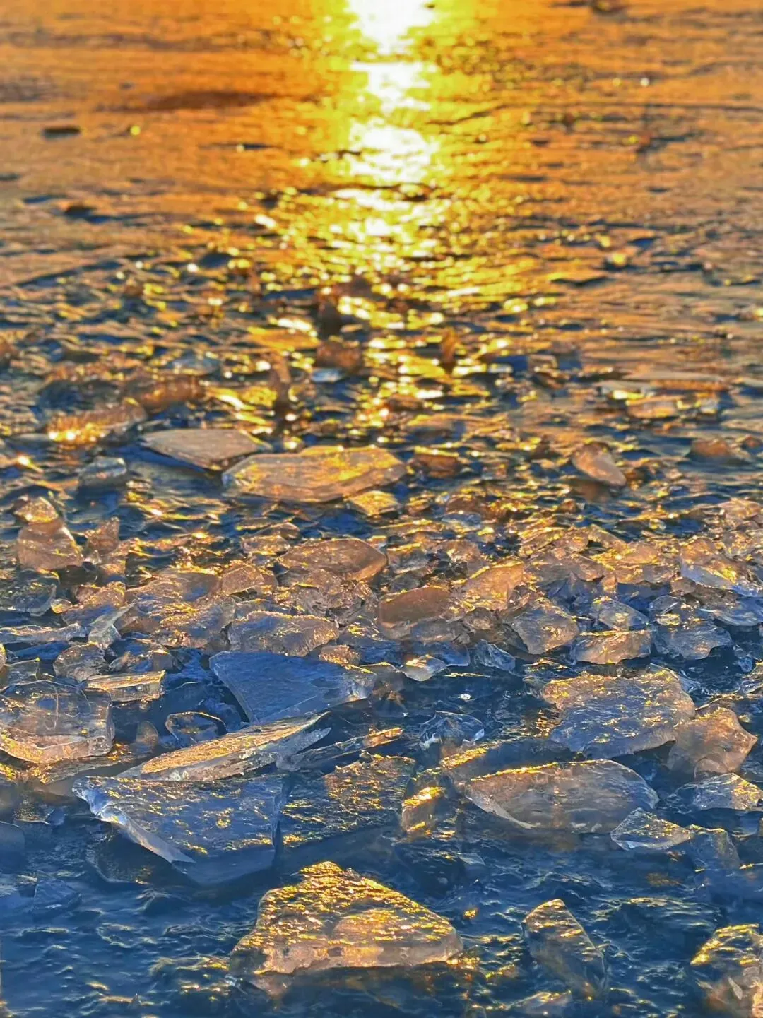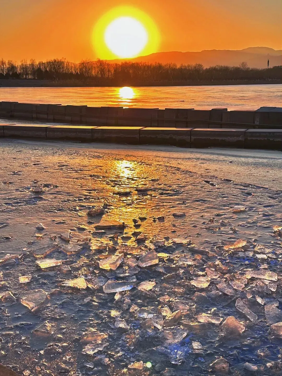 是天气很好,阳光也很好的一天~在落日时分,和男朋友来到晋阳湖,看橘子味的碎冰冰🍊落日从黄色,转为橘黄色,又转为橘粉色,最后变为黄色橘色粉色蓝色的渐变色,湖面上的冰块在落日下闪闪发光,眼睛看到的真的比相机📷里美很多,大家想看“橘子海”的可以在下午5点来,能一直看到6点左右~这是今天拍到的感觉最棒的一张!走着走着,正好看到一块冰映射出了夕阳🌇立马拍了下来~