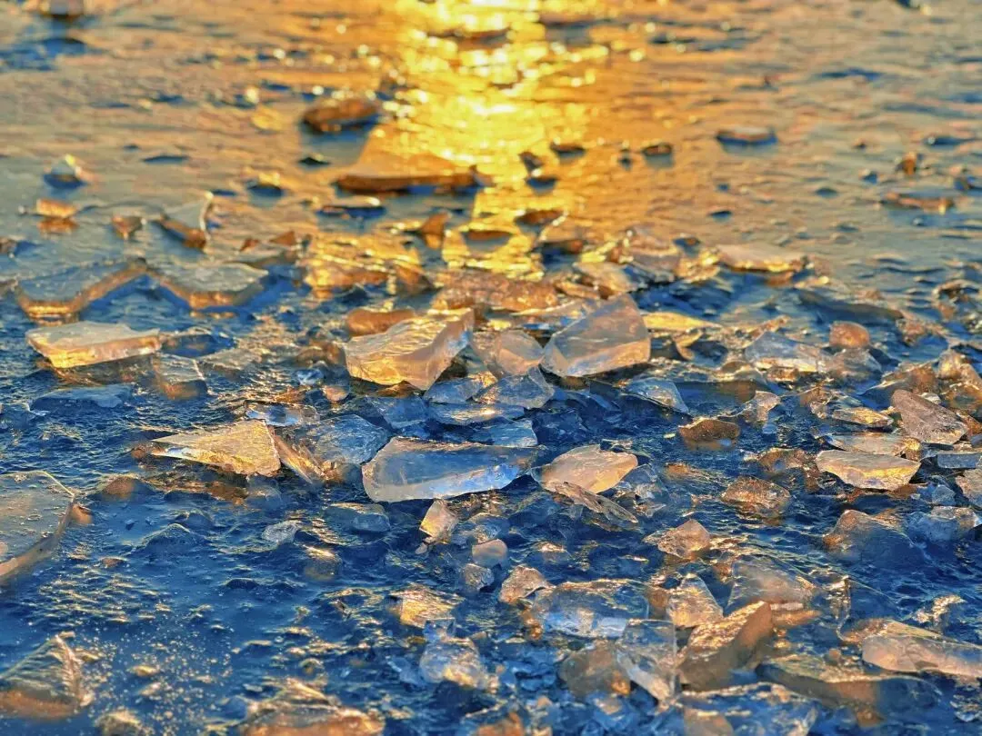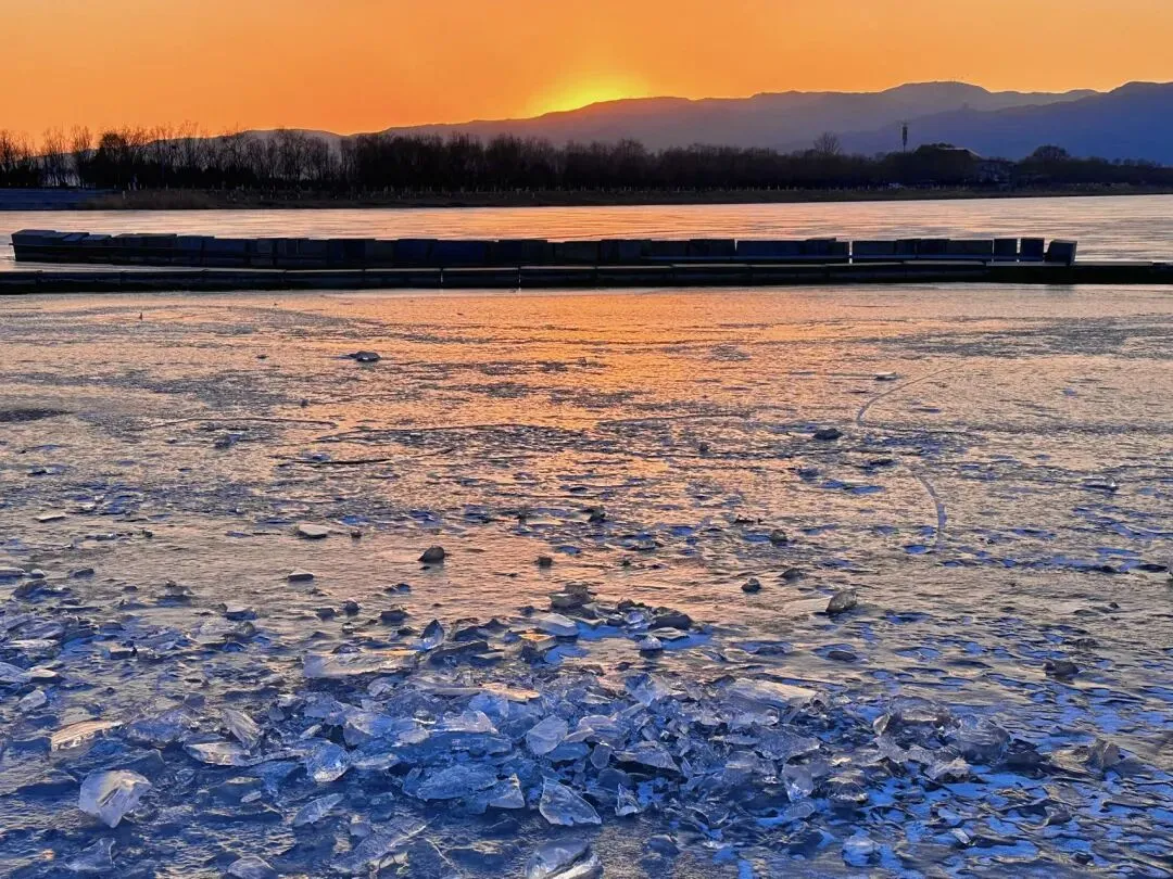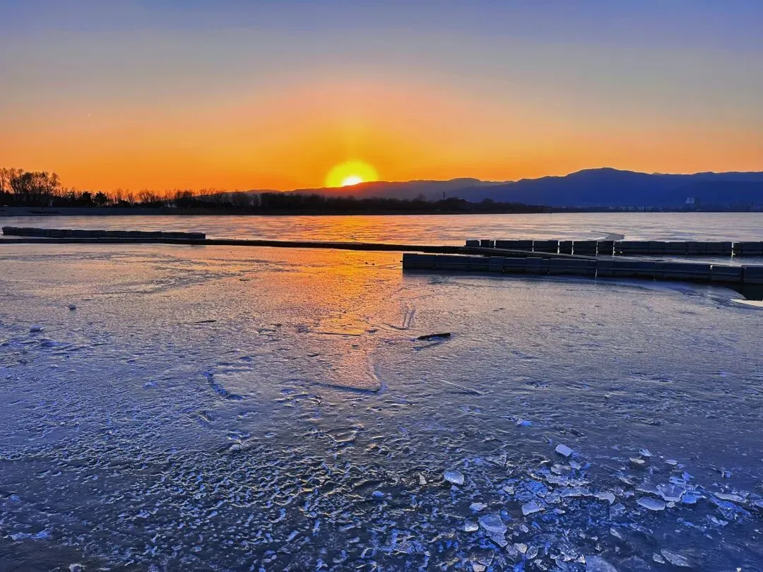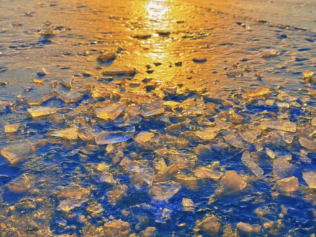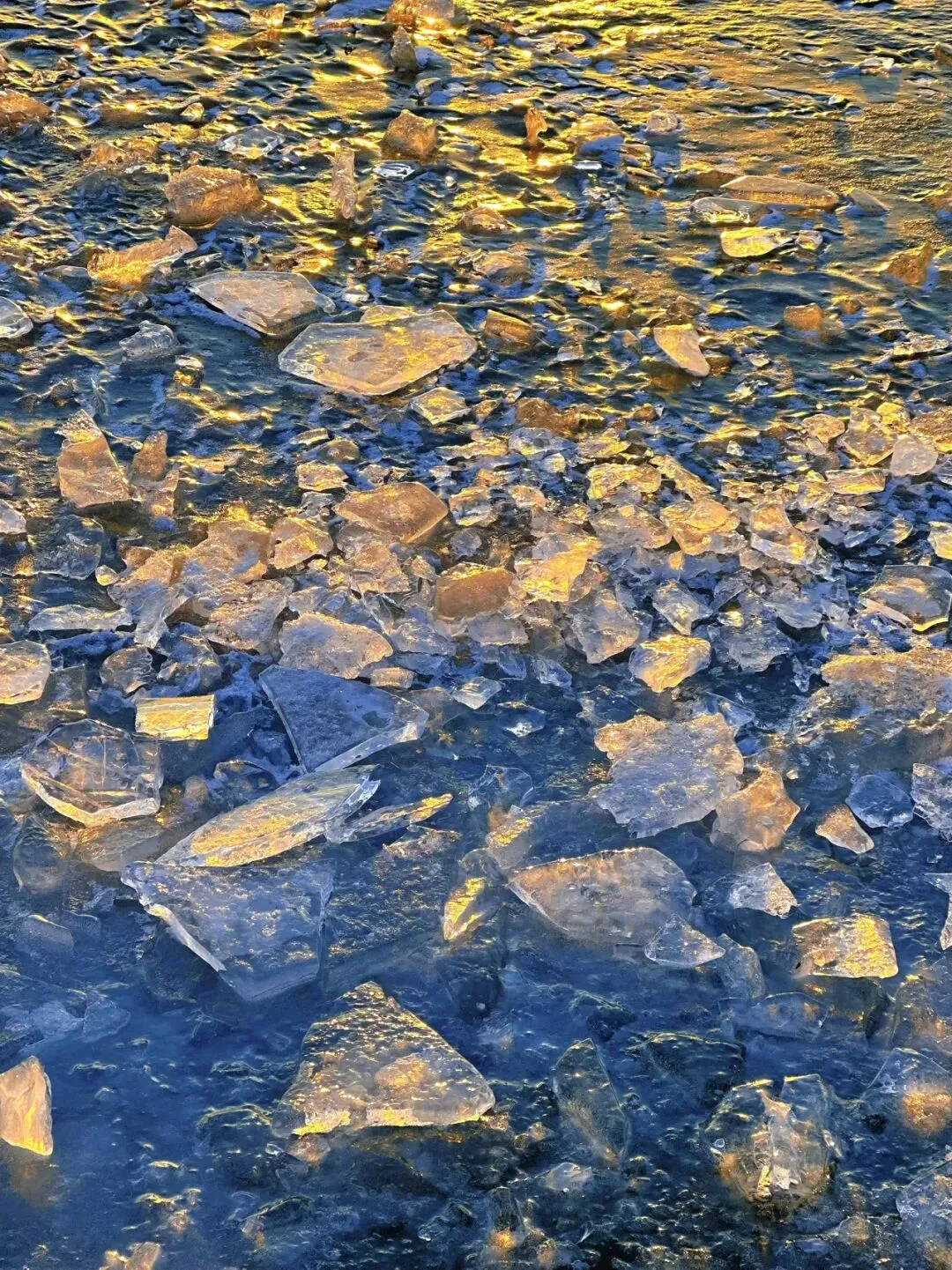 是天气很好,阳光也很好的一天~在落日时分,和男朋友来到晋阳湖,看橘子味的碎冰冰🍊落日从黄色,转为橘黄色,又转为橘粉色,最后变为黄色橘色粉色蓝色的渐变色,湖面上的冰块在落日下闪闪发光,眼睛看到的真的比相机📷里美很多,大家想看“橘子海”的可以在下午5点来,能一直看到6点左右~这是今天拍到的感觉最棒的一张!走着走着,正好看到一块冰映射出了夕阳🌇立马拍了下来~