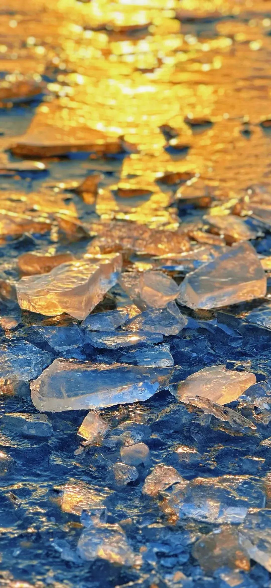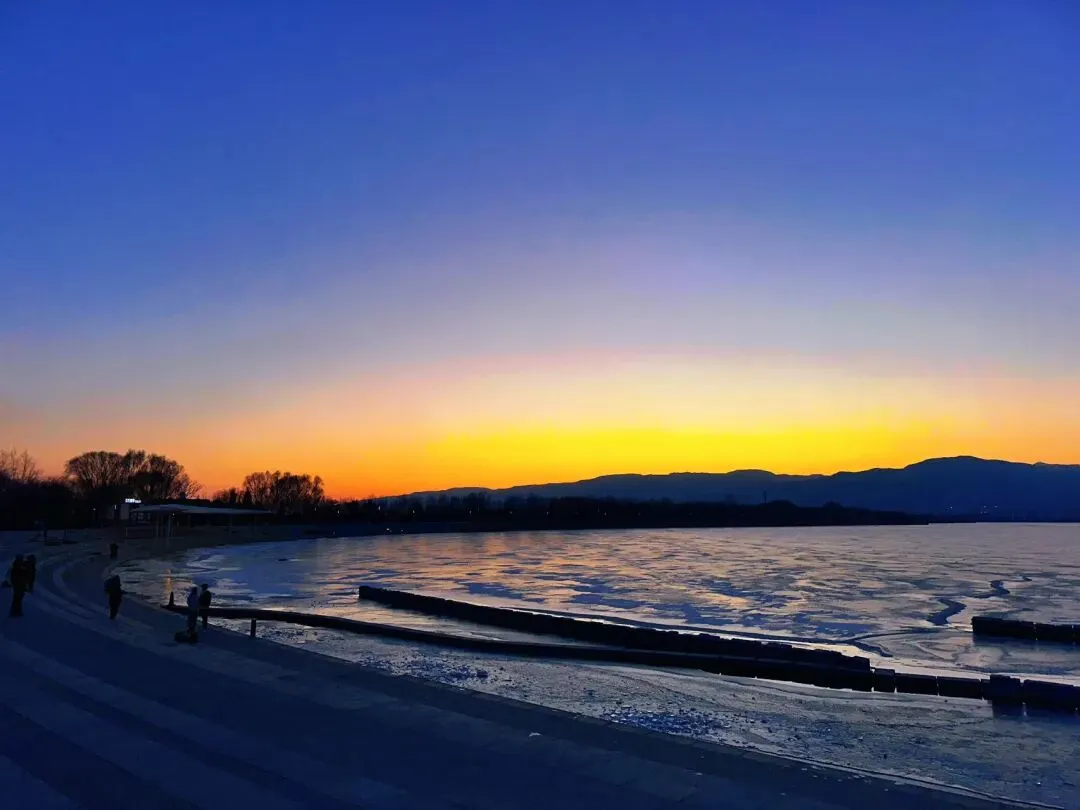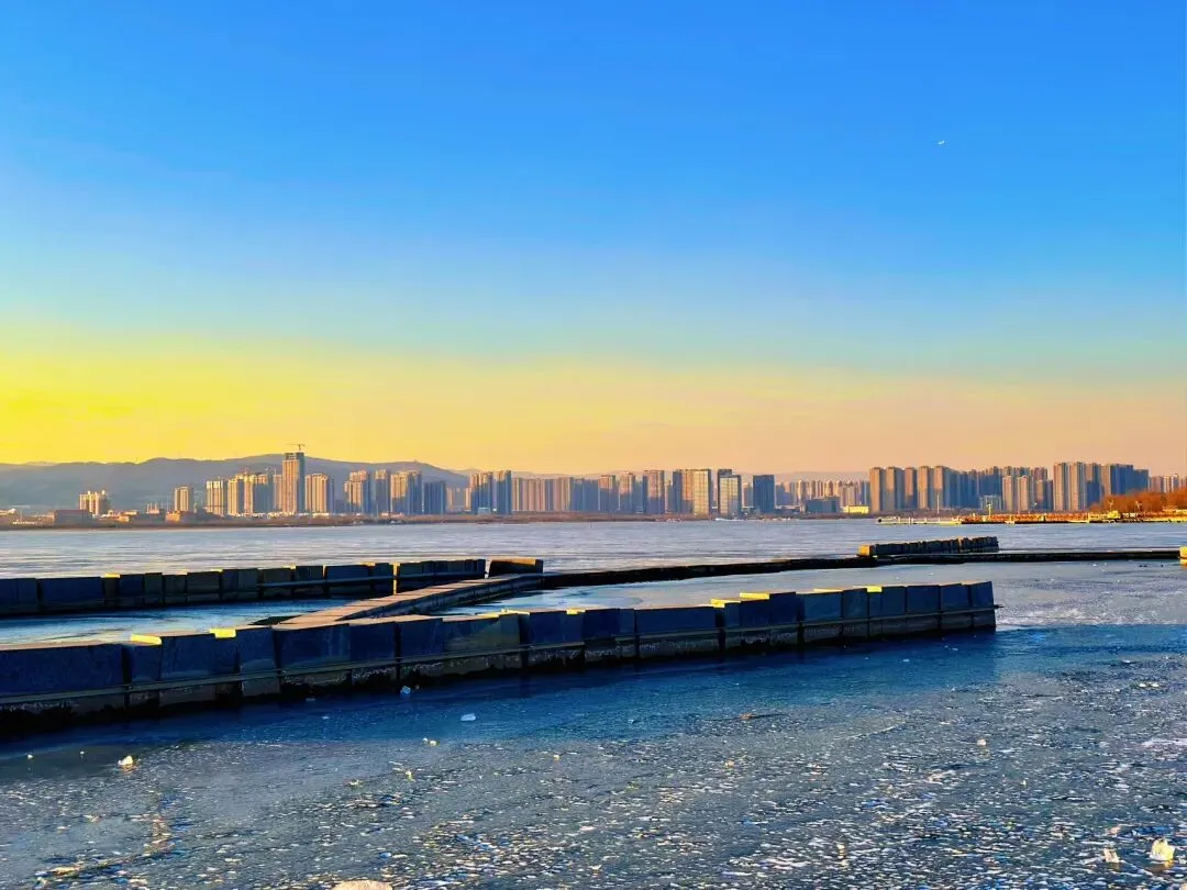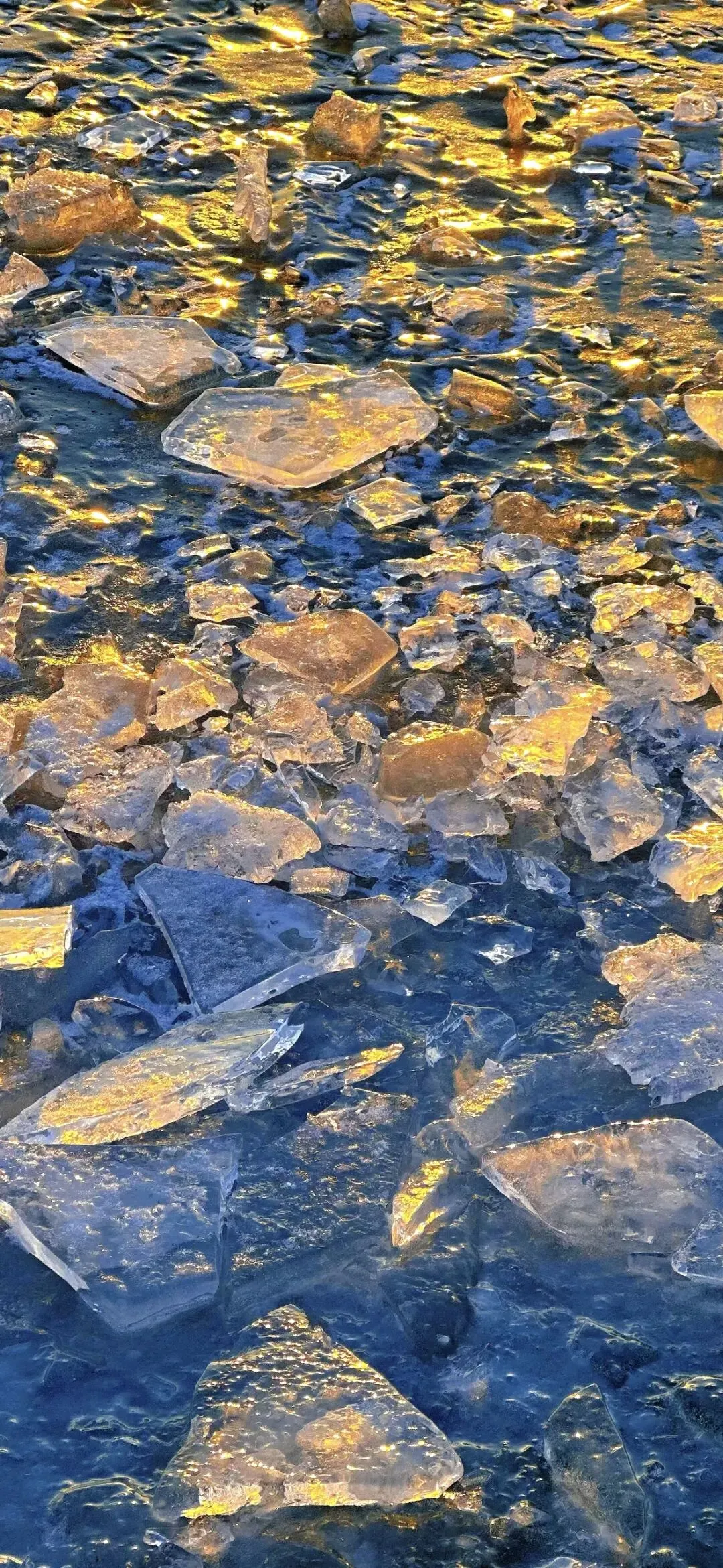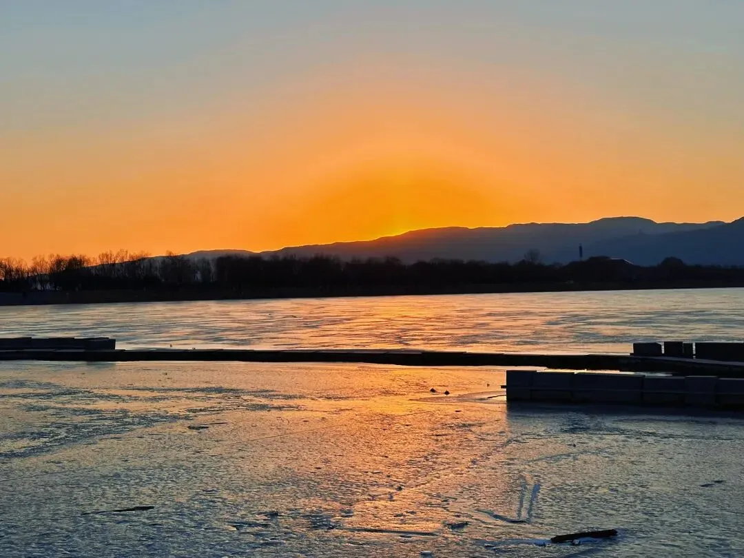 是天气很好,阳光也很好的一天~在落日时分,和男朋友来到晋阳湖,看橘子味的碎冰冰🍊落日从黄色,转为橘黄色,又转为橘粉色,最后变为黄色橘色粉色蓝色的渐变色,湖面上的冰块在落日下闪闪发光,眼睛看到的真的比相机📷里美很多,大家想看“橘子海”的可以在下午5点来,能一直看到6点左右~这是今天拍到的感觉最棒的一张!走着走着,正好看到一块冰映射出了夕阳🌇立马拍了下来~