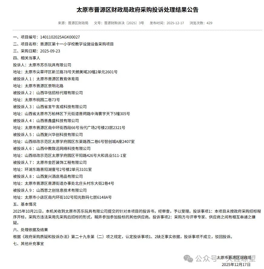 2025年10月21日,太原市苏乐玩具有限公司(地址:尖草坪区新兰路78号天朗美域)率先投诉。该公司在投诉书中称,晋源区教体局未按法定程序开标,“先采购后招标,糊弄参与投标的企业”,更直接指出“采购方与评审专家、供应商可能存在串通”,并将山西省言午言成科技、山西中教致远网络科技等5家投标供应商一同列为被投诉人。