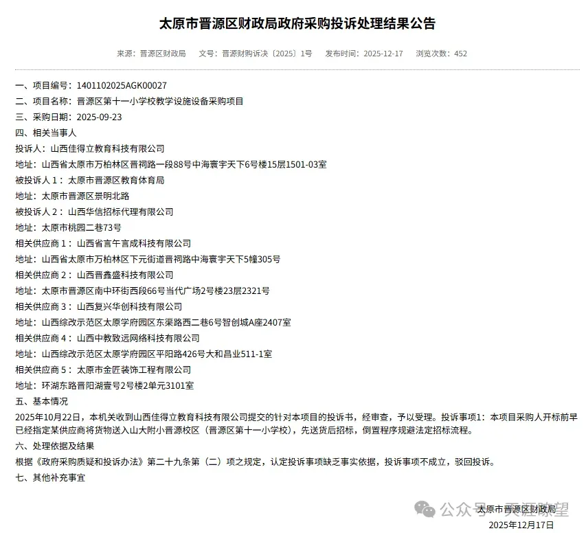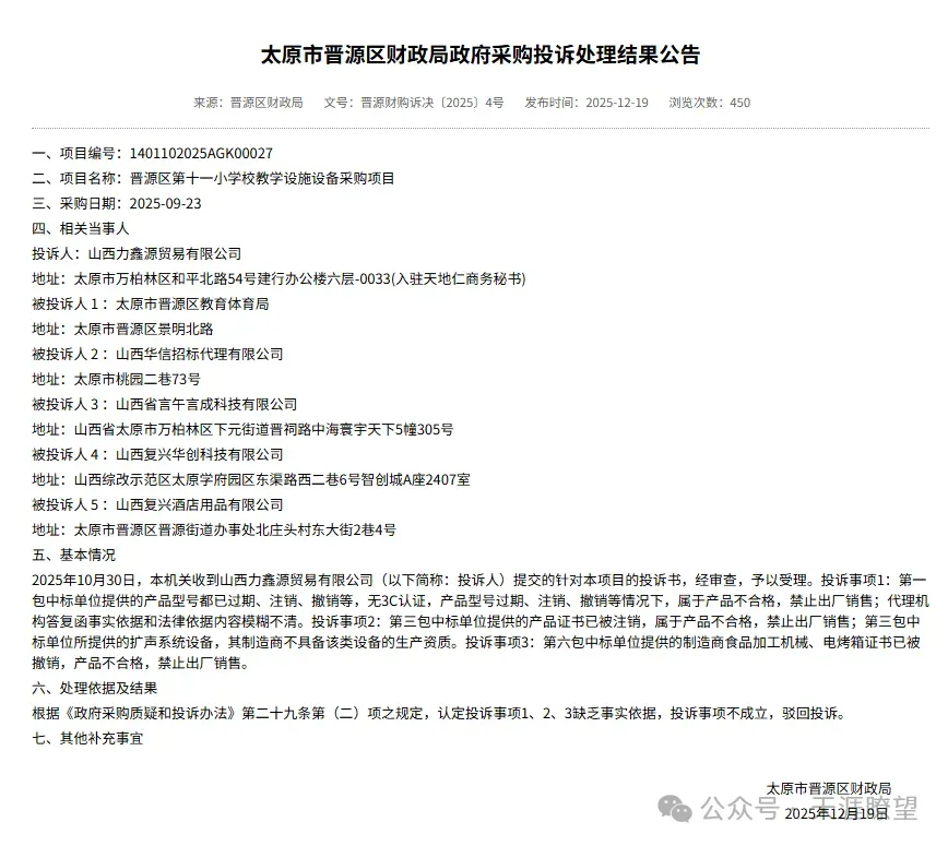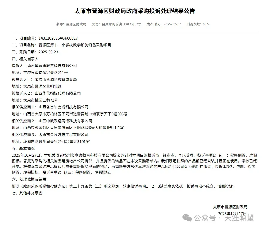 三是“驳回投诉”依据是否充分?企业提交的现场照片与采购方说法冲突,公众希望监管机关公开调查细节,包括是否实地核查设备来源、调取房企协议、询问学校证人等。晋源区财政局何以冒天下之大不韪!