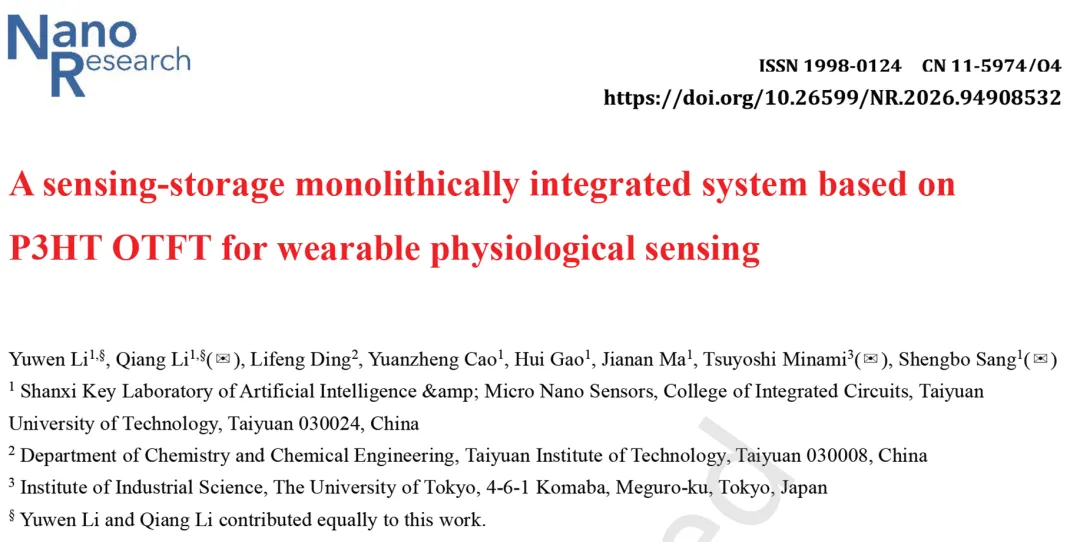 文章信息:Yuwen Li, Qiang Li, Lifeng Ding, et al. A sensing-storage monolithically integrated system based on P3HT OTFT for wearable physiological sensing