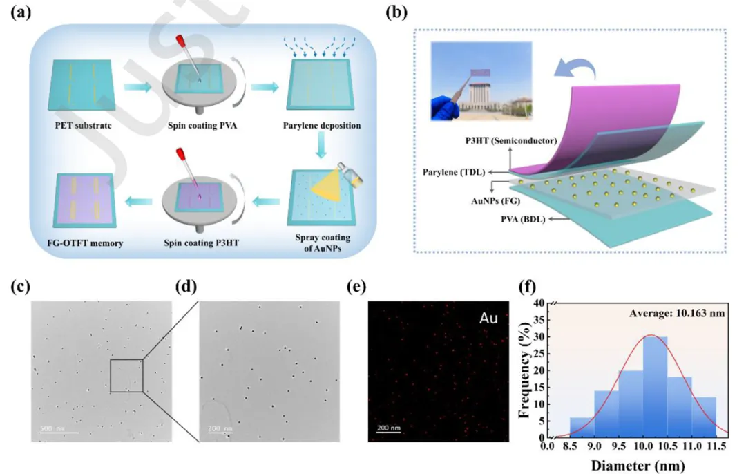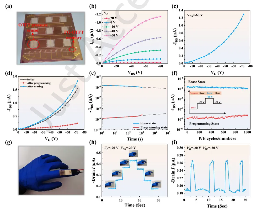 图1-制备流程与器件结构示意图:图1展示了P3HT基浮栅有机薄膜晶体管存储器的制备流程与结构设计。制备过程采用全溶液法旋涂工艺,依次在柔性PET衬底上沉积金栅极、PVA阻挡层、金纳米颗粒浮栅层、Parylene隧穿层和P3HT半导体层,最后制备源漏电极。该结构采用底栅顶接触设计,层间界面清晰,工艺兼容性强,适用于大面积柔性集成。图1(c)-(d)的TEM图像显示金纳米颗粒呈离散球形分布,平均粒径约10.16 nm,分布均匀,为浮栅层提供稳定的电荷存储节点。该设计不仅保证了存储器的机械柔性,也为后续与压力传感器的单片集成奠定了基础。图2-存储器电学与存储性能表征:图2展示了FG-OTFT存储器的电学特性与存储性能。输出特性曲线显示器件在低漏压下呈线性区,随电压升高进入饱和区,表现出典型的p型晶体管行为。转移特性曲线在编程与擦除操作后出现明显的阈值电压偏移,存储窗口达18 V。图2(e)的电荷保持测试表明,在-20 V读取电压下,器件保持时间超过10⁵ s,满足可穿戴系统中短期数据缓冲需求。图2(f)的耐久性测试显示,经过1000次编程/擦除循环后,电流开关比仍保持在4.2×10²左右,表明器件具有良好的循环稳定性与可靠性。