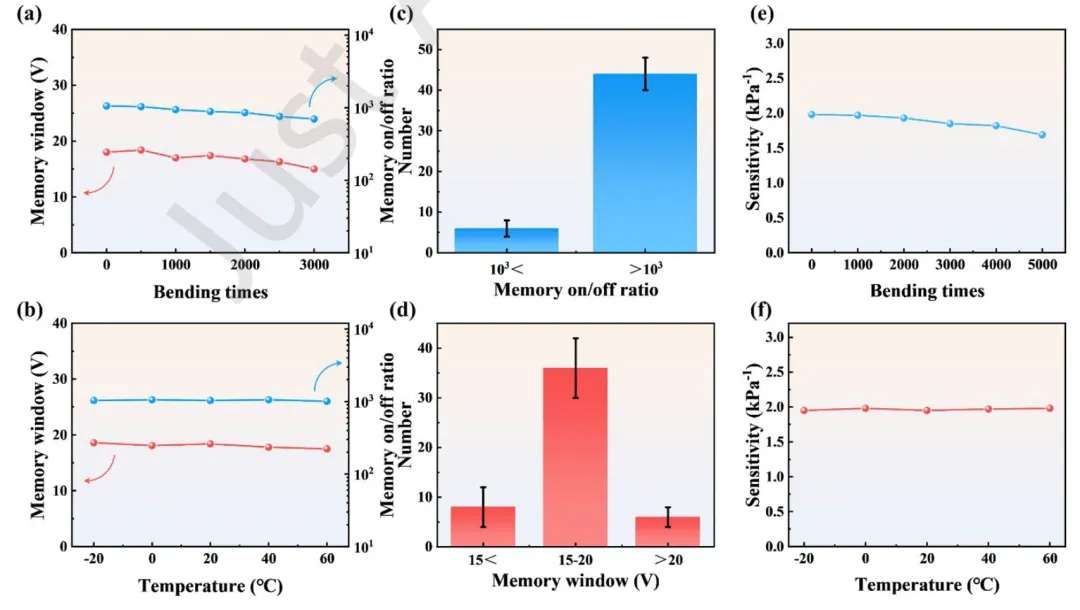 图3-器件机械与环境稳定性测试:图3系统评估了存储器与压力传感器在弯曲与温度变化下的稳定性。图3(a)显示经过3000次弯曲后,存储器窗口与开关比仅轻微下降,说明其具备优异的机械耐久性。图3(b)表明在-20°C至60°C温度范围内,存储器性能几乎不受影响。图3(c)-(d)统计了50个器件的存储窗口与开关比分布,显示批次内一致性良好,验证了溶液工艺的可靠性。图3(e)-(f)进一步显示压力传感器在5000次弯曲和宽温范围内灵敏度保持稳定,满足可穿戴应用对机械与环境适应性的要求。