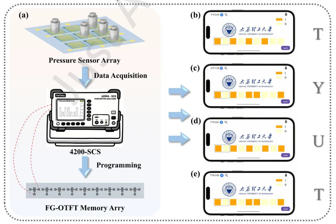 图5-系统功能验证与应用演示:图5直观地演示了该单片集成感知-存储系统的核心功能和工作流程。图5(a)展示了研究人员通过4200-SCS半导体参数分析器,手动对存储器阵列施加编程/擦除电压的控制场景,体现了系统在实验验证阶段的精确可控性。图5(b)至(e)是本次研究的核心成果展示:系统成功将外部压力信号(如放置20克砝码)转换为电信号,并进一步编码写入了四个字母“T”、“Y”、“U”、“T”所对应的7位ASCII二进制码(分别为1010100, 1011001, 1010101, 1011001)。尤为关键的是,图中揭示了该1×9存储器阵列的创新设计:前两位被专门设计为校验位(固定为“10”),只有在满足此验证条件后,后续的存储单元才能进行编程/擦除操作。