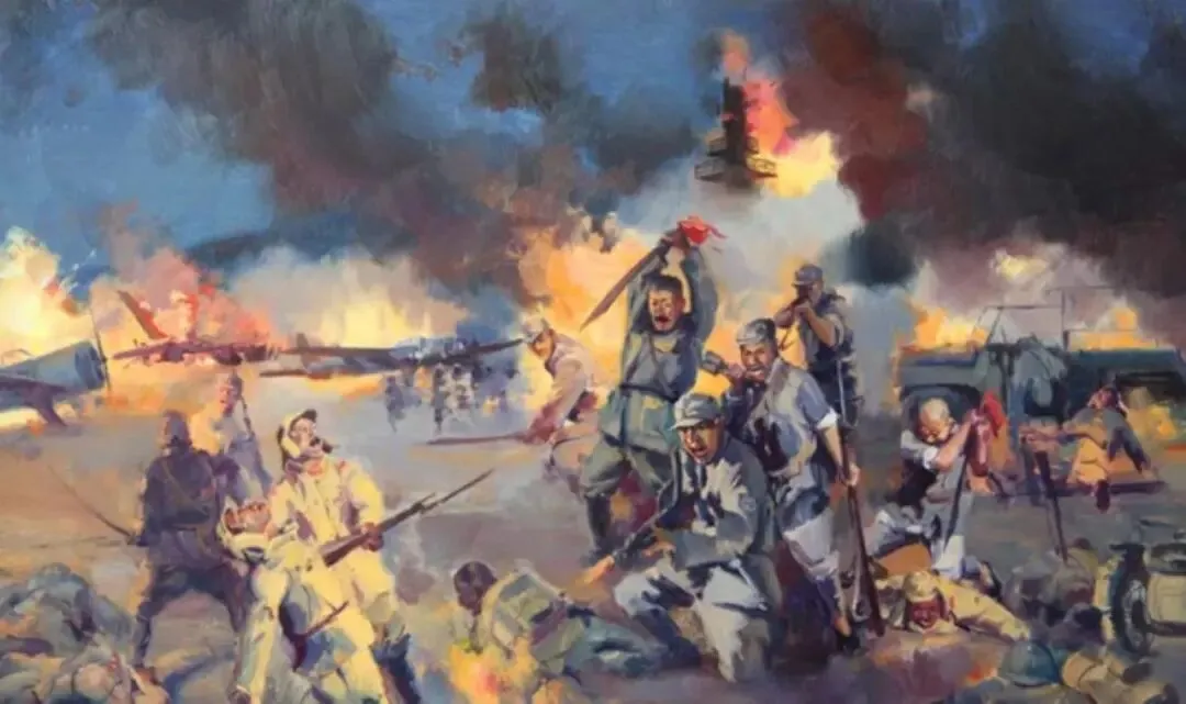 两军在火光中开始了近距离的肉搏战,枪声、喊杀声、手榴弹的爆炸声、战机的轰鸣声交织在一起,响彻夜空。日军飞机的座舱内,值班的飞行员们惊慌失措地发动飞机,试图升空逃脱,并用机上的机枪盲目扫射,子弹在跑道上四处飞溅;还有的飞行员慌乱地逃出飞机,想要寻找隐蔽处抵抗,结果刚一落地,就立即被十一连的官兵用刺刀刺倒。