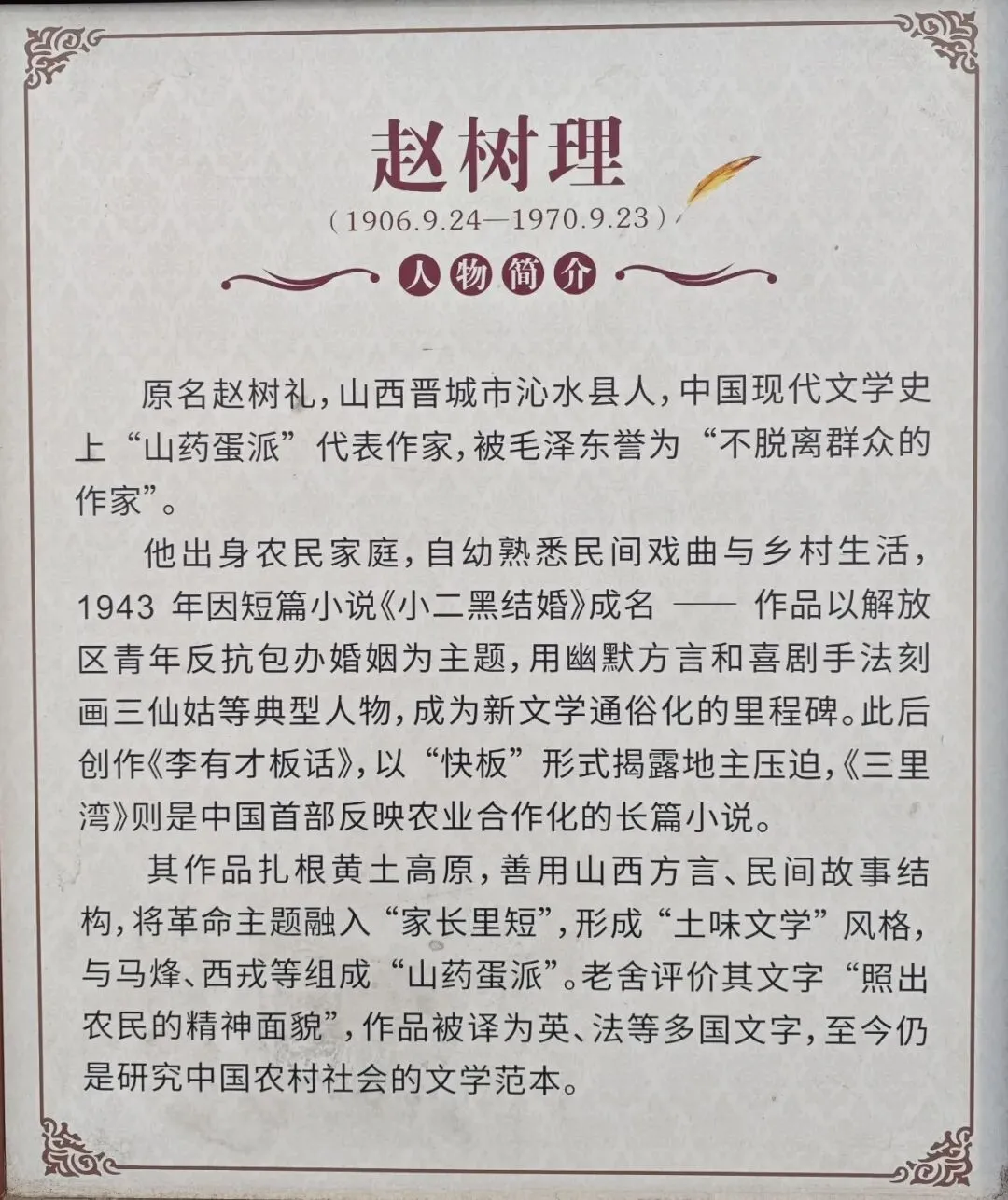 1964年,赵树理从中国作家协会调回山西,1965年定居这里,直到1970年含冤逝世。这五年应该是他最幸福也最凄凉的岁月,晚年最后的著作《十里店》在这里完成,之后遭受了残酷迫害离世。直到1978年平反昭雪,恢复了一个伟大作家的名誉。