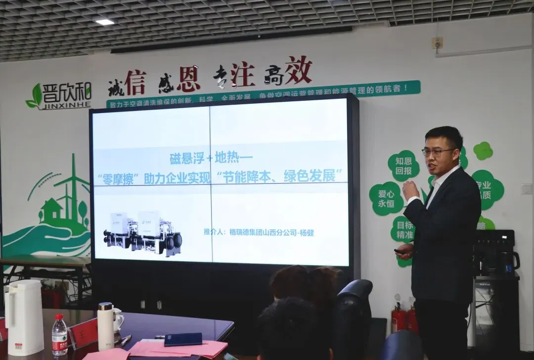 行业交流研讨环节成为本次会议的亮点。山东海创空调有限公司总经理张传温、山西成城科技有限公司副总经理侯林、山东格瑞德集团有限公司山西分公司副总经理杨健分别围绕企业发展现状、节镍型不锈钢防护设备、磁悬浮机组产品进行详细介绍;山西晋欣和科技有限公司营销总监王静以能源托管赋能低碳转型 碳汇市场激活绿色价值为题分享行业前沿观点。随后,与会领导围绕行业发展现状、资源对接需求、未来合作方向展开深入研讨,现场思想碰撞、共识凝聚,为企业协同发展搭建了高效沟通平台。