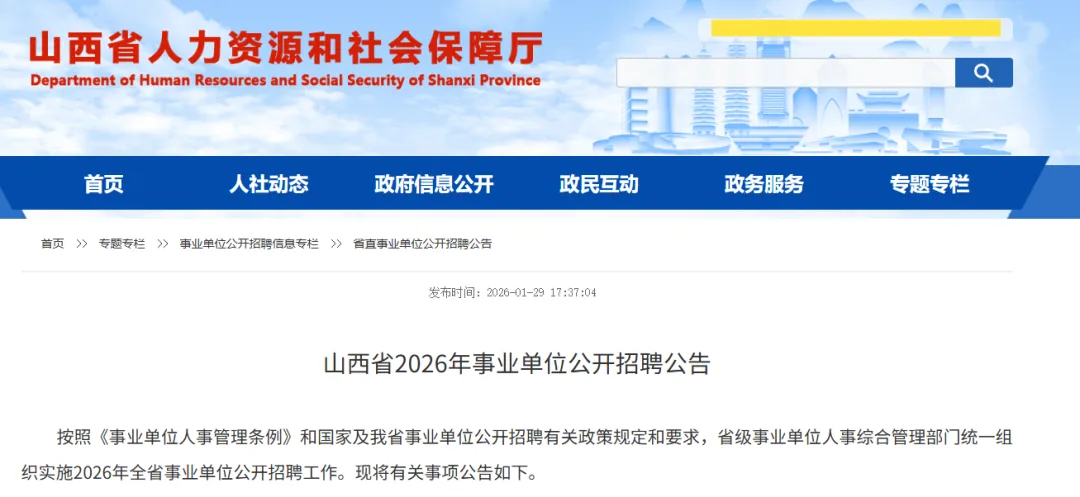 按照《事业单位人事管理条例》和国家及我省事业单位公开招聘有关政策规定和要求,省级事业单位人事综合管理部门统一组织实施2026年全省事业单位公开招聘工作。现将有关事项公告如下。