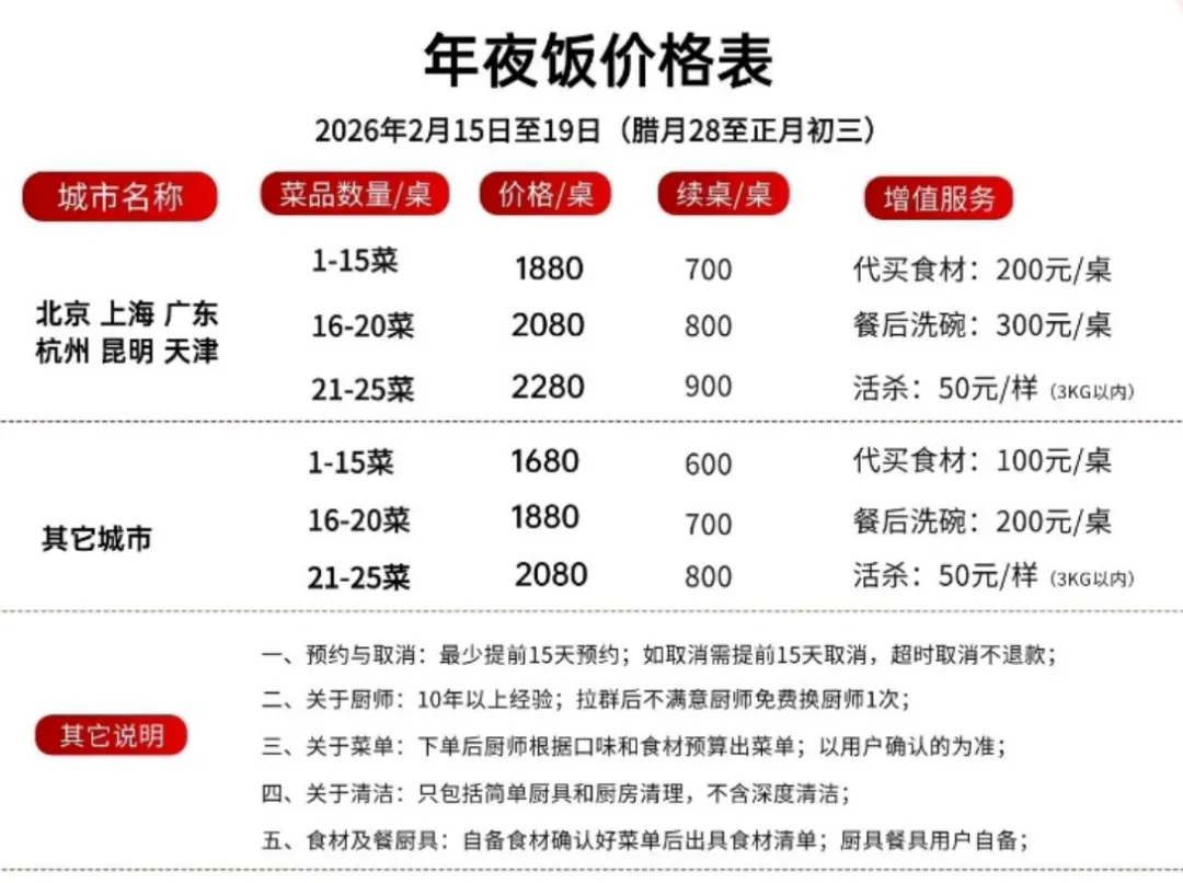 市场火热也需警惕服务质量参差。业内人士提醒,预订时应确认厨师资质,并提前详细沟通菜单与忌口,让这顿“移动的年夜饭”既新颖又安心。