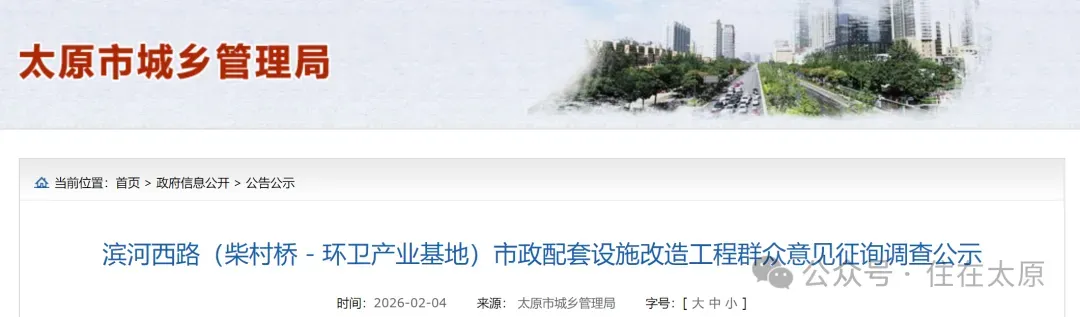 针对这些痛点问题,太原市城乡管理局于2026年2月4日发布了《滨河西路(柴村桥-环卫产业基地)市政配套设施改造工程群众意见征询调查公示》。这则公示的发布,意味着这条承载着太原最大车流量的快速路之一,即将迎来一次贯穿全线的系统性“大修”。