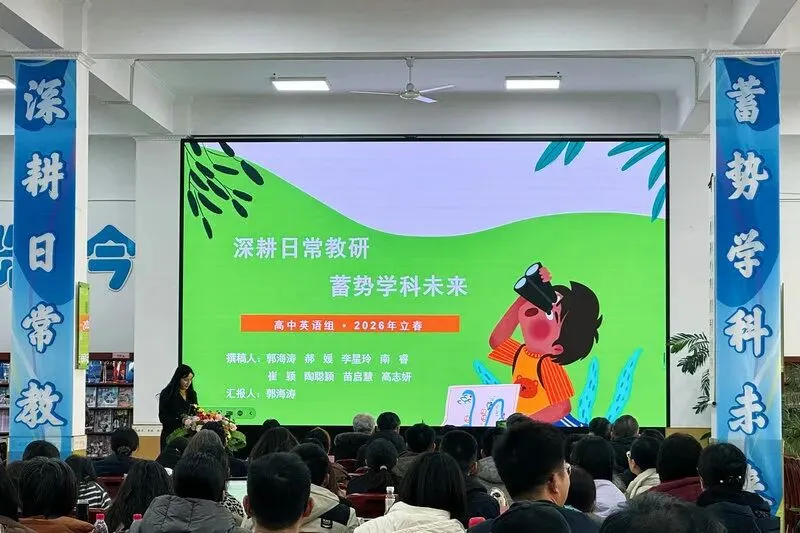 英语学科教研员郭海涛老师分校区和年级阐述集体备课重点,以基础知识巩固为根基,积累优质资源,整合外研版高中英语电子教学资源与高考真题,组内依托备课组长、高级编辑、优课高手、命题专家等骨干力量,通过讲座学习、课例研讨、课题研究提质增效,更以公众号建设为窗口,传递学科组理念,扩大宣传影响力。