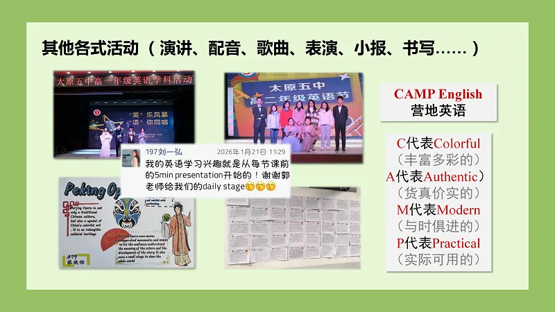 音美学科教研员王明哲老师以“实践悟真,美育心灵”为宗旨,将常规教学与校本选修相结合,开展校园歌手大赛、中德乐团专场音乐会、中国文化屏风设计大赛等丰富活动,打造全国公开课《唱脸谱》等优质课例。音美学科组以其扎实工作与创新实践,推动学校获评全国美育示范学校。组内不仅打造了丰富的美育活动,更建立起完善的评价体系与资源库,让美育持续滋养学生心灵。