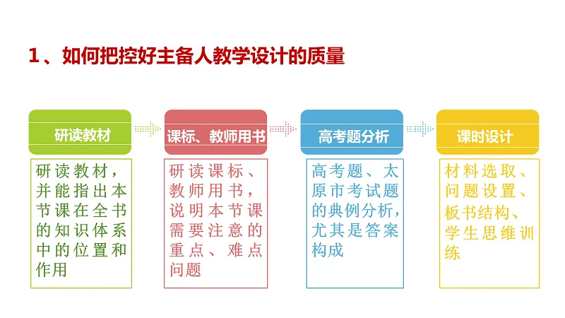 政治学科教研员肖军老师聚焦“质量把控”,分享主备人教学设计流程——深耕教材、课标、教师用书,分析高考题并完成课时设计。政治学科通过全组研讨交流,积累七本书配套资料与公众号典型案例,按课时搭建跨年级教学资料库。依托集体智慧整理高考题库,论证真题规律,减轻教学负担,让教学设计更具针对性。