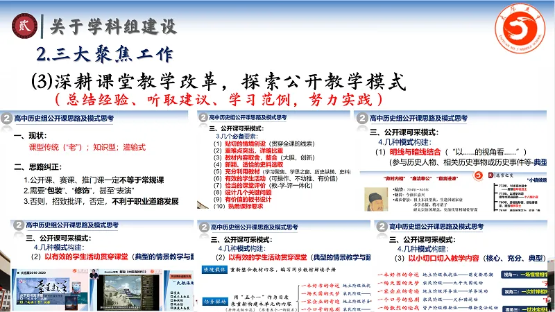 历史学科教研员黄戈老师结合学科特点,实行分年级精准教研:高一备新课、高二备习题、高三备复习。通过五次教研活动推进资源库建设、项目式成果汇总与校本课程体系完善。历史学科组重视青年教师培养,助力其通过公开课展示快速成长,同时结合现状与目标,下学期将继续完善资料库,聚焦高考复习冲刺策略,深挖教材文本价值。