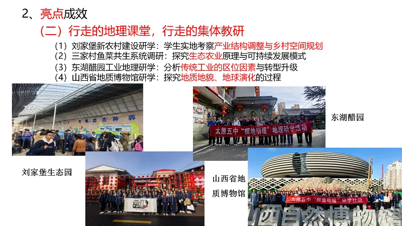 地理学科教研员张凤华老师创新“双线教研模式”,精细化打磨教学过程,打破学段界限,全力助力高三教学。以“行走的地理课题”为特色,开展实践型集体教研,积极参与太原市拔尖创新人才培养活动。针对资源建设短板、评价方式单一等问题,计划完善教学资源体系,深化内涵建设,推进评价改革,通过编制《行走五湖四海,探寻地理奥秘》校本教材,成立“探地明理”研学社团,搭建学生展示平台,同时加强跨学科融合与青年教师培养。
