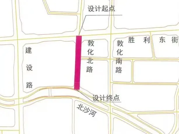 北起胜利街、南至北沙河(长约385米),用地约1.2公顷;规划红线宽30米:中间14.5米机动车道,两侧各1.75米绿化带,2.5米非机动车道,3. 5米人行道(含1.5米树穴带)。