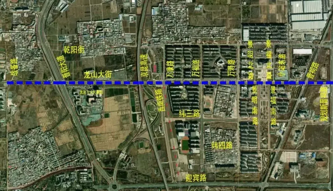 西起新晋祠路、东至阳光路(长约2240米),用地约6.7公顷;规划红线宽30米:中间14.5米机动车道,两侧各2米绿化分隔带,2.5米非机动车道,3.25米人行道(含树穴带)。