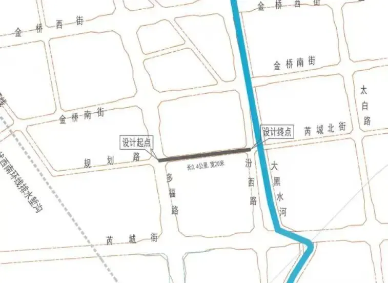 西起多福路、东至汾西路(长约425米),用地约0.8公顷;规划红线宽20米:中间13米车行道,两侧各3.5米人行道(含树穴带)。