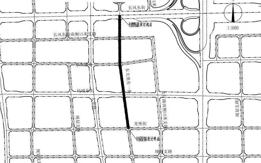 北起长风东街、南至龙堡街(长约767米),用地约1.1公顷;规划红线宽15米:中间9米车行道,两侧各3米人行道(含树穴带)。