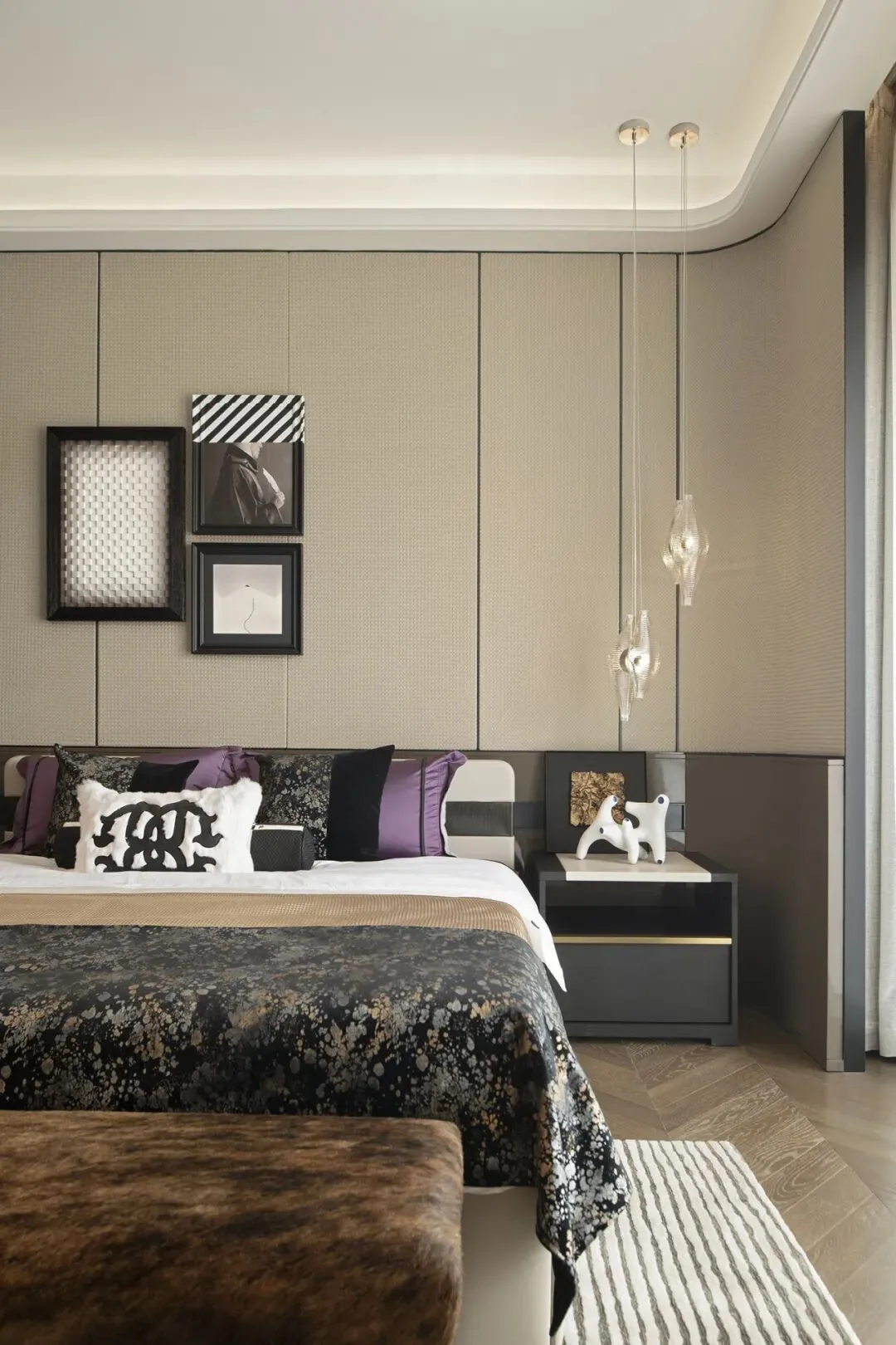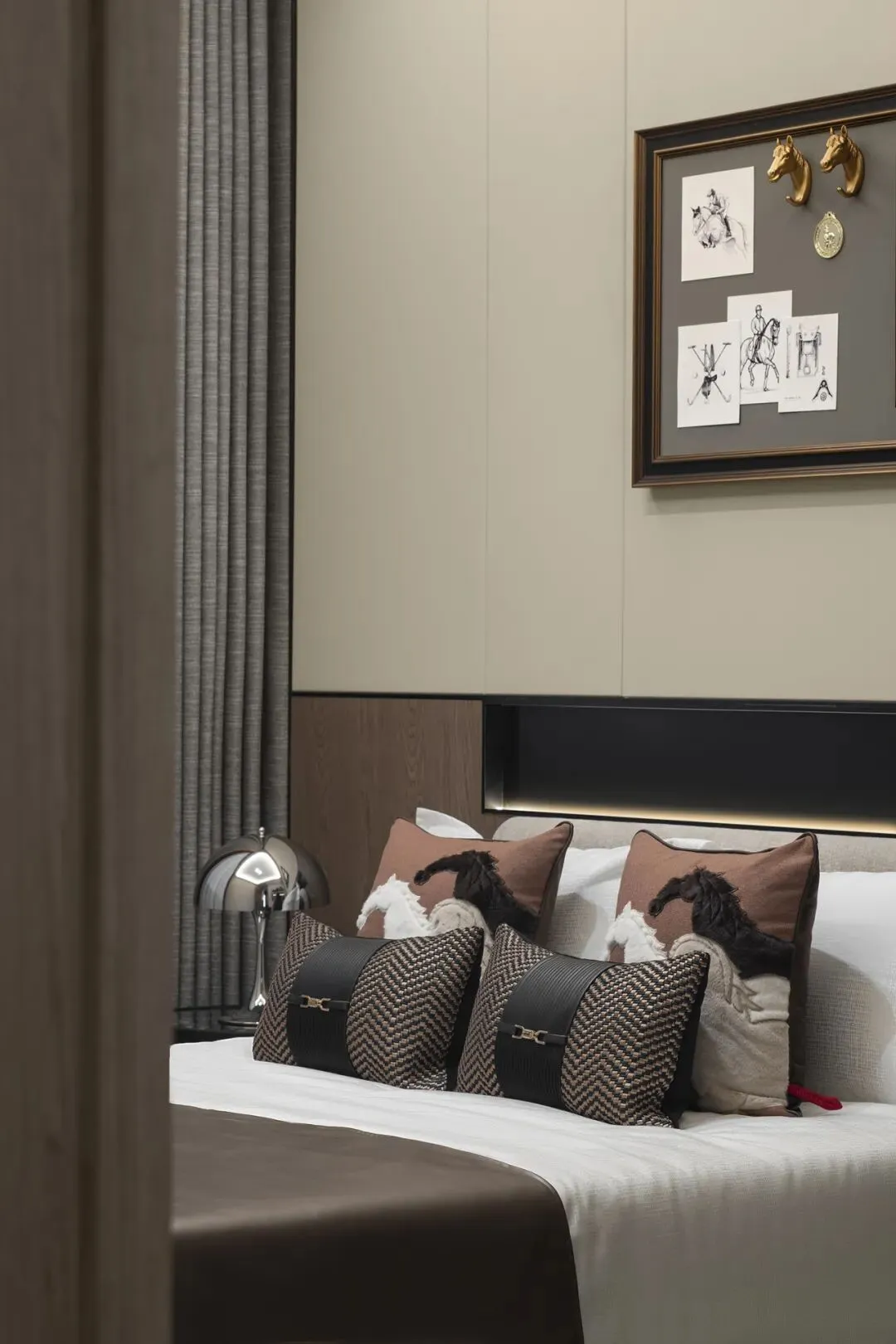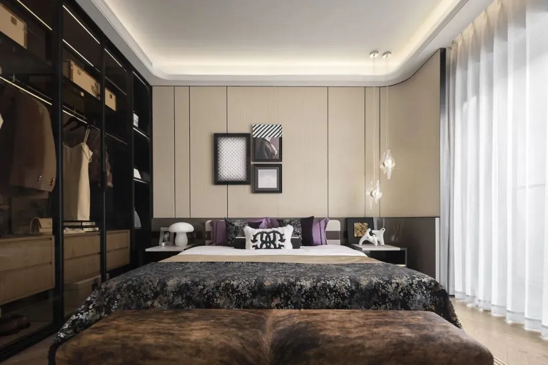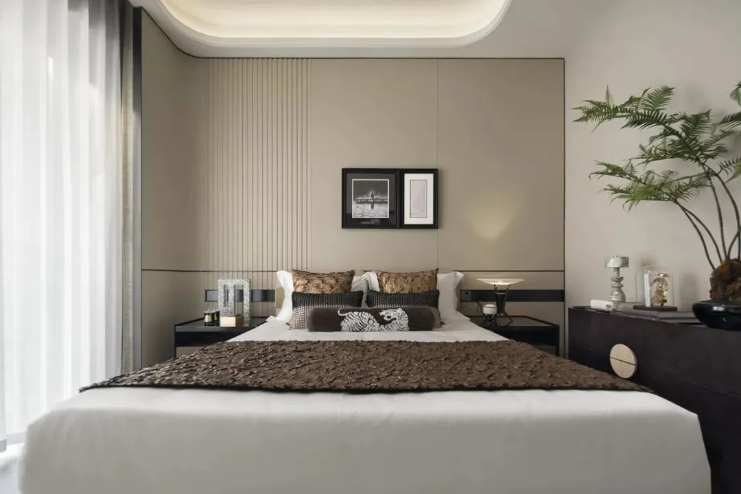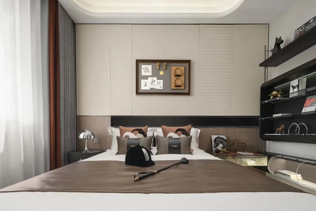 次卧以低饱和灰咖色为基调,
