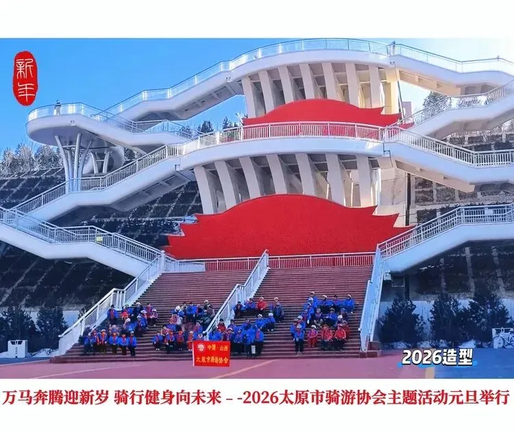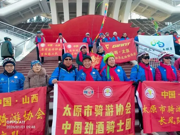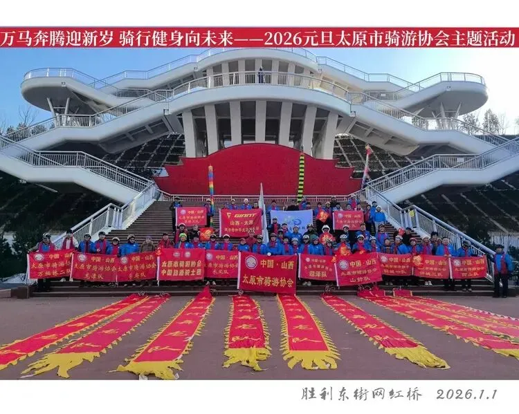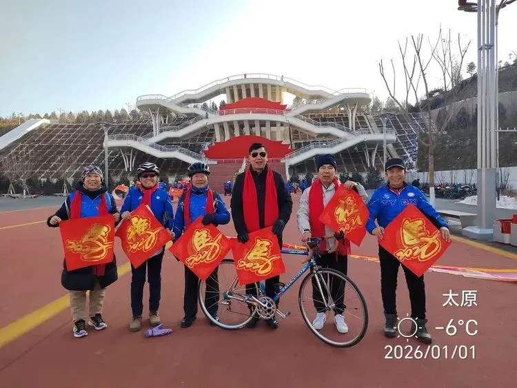 2026年1月1日清晨,太原胜利东街网红桥(天字桥)上红旗招展,晨光初露。太原市骑游协会“万马奔腾迎新年,骑行健身向未来”主题首骑活动在此启幕,一群身着统一蓝色骑行服、佩戴鲜红围巾的银龄志愿者,用活力骑行迎接新年第一缕曙光,为龙城太原的元旦增添了浓墨重彩的喜庆氛围。