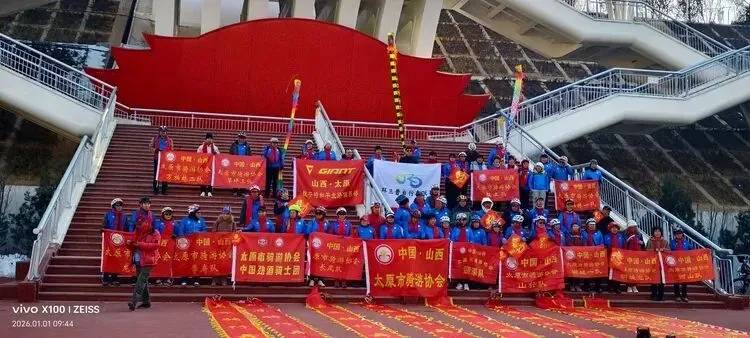 随着欢快的节奏响起,常务副会长马爱军引领舞龙队员上演“风火轮”绝技,彩龙穿梭舞动,点燃现场气氛。“新年快乐!”“新年好!”的嘹亮口号铿锵有力,回荡在网红桥上空,与远处的太原解放纪念碑相映成景,既有节日的欢腾,更有精神的传承 。仪式结束后,骑友们列队骑行下山,车轮滚滚间,不仅是健身之路的延续,更是银龄风采的生动展现。
