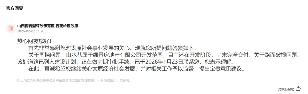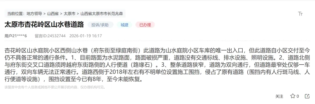 1、目前路面为水泥路面,路面破损严重,道路没有交通标线、排水设施、照明设施。2、道路北侧与府东街交叉口道路须跨越府东街路侧的人行便道(路缘石)。3、整条道路狭窄,道路为双向通行,但道路最窄处仅够一车通行,双向车辆无法正常通行。道路西侧于2018年左右有不明单位设置施工围挡,侵占了原有道路(围挡内有人行斑马线、人行便道等设施),围挡设置至今已有8年,至今未能恢复。官方回复称:关于围挡问题,山水巷属于绿景房地产有限公司开发范围,目前还在开发阶段,尚未完全交付。关于路面破损问题,该处道路已列入建设计划,正在做前期审批手续。买房看似简单的事儿,其实背后涵盖的信息量巨大宏观的包括经济、规划、金融、交通配套、教育、城市逻辑,微观的方面包含产品、户型、园林、入户大堂、装修、采光、噪音、容积率、烂尾风险等等。买房不入坑,欢迎加微信咨询太原买房那些事儿。
