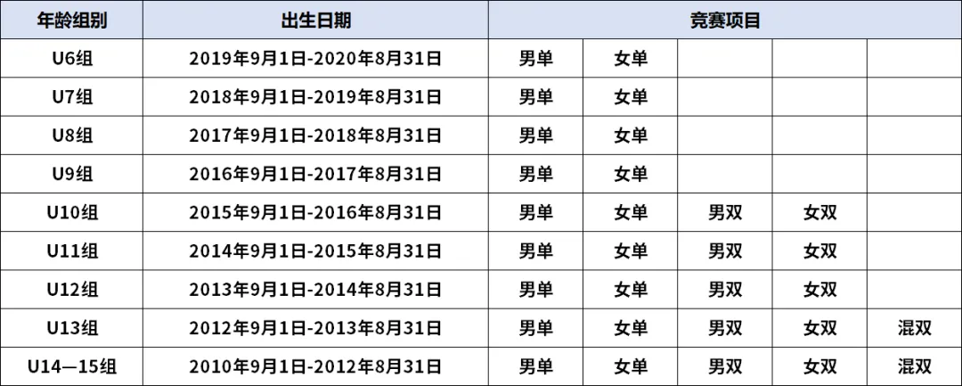 5.2年龄要求5.2.1参加公开赛组别:以身份证为准(例如:9岁为2016年9月1日-2017年8月31日出生,其他年龄段以此类推)。报名人员应按照个人实际情况申报相应组别,如有隐瞒,发现后将取消其参赛资格和成绩。5.2.2参加家庭亲子赛组别的家长:①必须是该青少年选手的直系亲属(父母、法定监护人),检录须出示户口本或小球员出生证明以验证亲子关系;②亲子组合可以是父子、母子、父女、母女四类组合;③家长搭档年龄原则上不超过55周岁(以比赛日为准)。身体健康,无心脏病、高血压等不适宜剧烈运动的疾病。参赛即视为对自身健康状况负责。