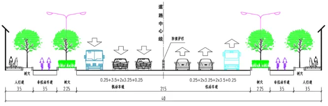 中间21.5米机动车道,两侧各2.25米绿化带,3.5米非机动车道,3.5米人行道(含树穴)。