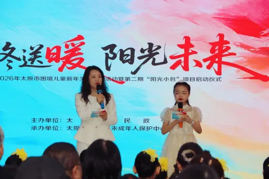 1月6日,由太原市民政局主办、太原市救助站(未成年人保护中心)承办的2026年太原市困境儿童新年关爱主题活动暨第二期“阳光小包”项目启动仪式顺利举行。太原市民政局、太原科技大学人文社科学院、太原市慈善总会、太原市救助站、太原市福利彩票发行中心等单位领导出席活动。来自基层民政部门、学校、爱心社会组织、公益伙伴及儿童家长代表等80余人欢聚一堂,共迎新年。