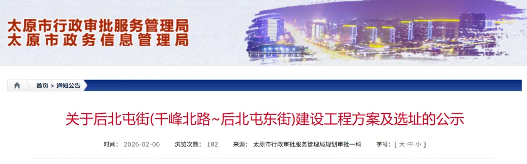 后北屯街(千峰北路~后北屯东街)工程,西起千峰北路,东至后北屯东街,道路全长约470米,规划红线宽度15米,道路性质为城市支路。